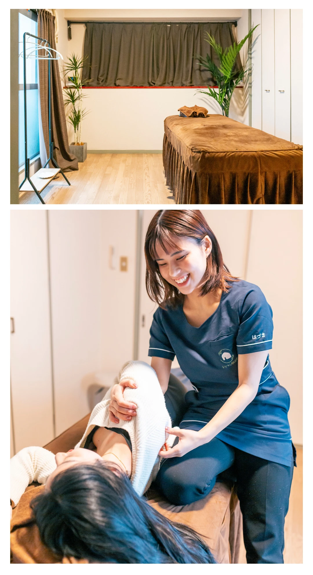 動きやすい服装であればそのまま施術が可能です。必要に応じてお着替えをご用意しております。